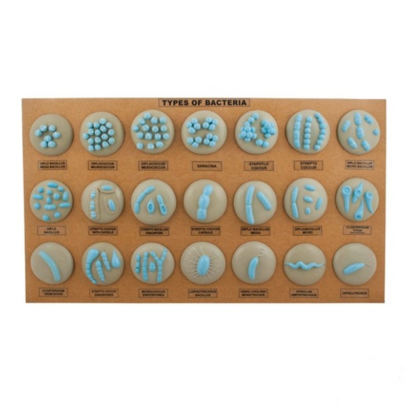 Õppevahend, mis koosneb 21 tahvlile kinnitatud plastmudelist, mis illustreerivad 21 erinevat bakterikuju (iga mudeli läbimõõt: 8 cm). Kõik bakterid on märgistatud nende ladinakeelsete nimedega. Tahvli kogumõõtmed: 71 x 40 x 3,5 cm.