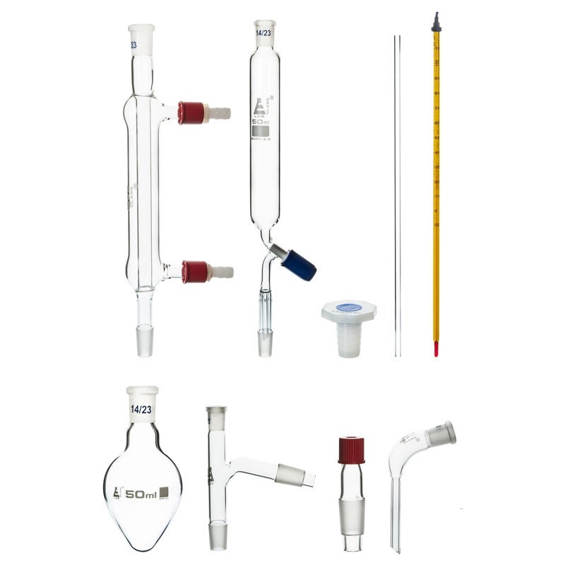 Toote sisu: Liebigi kondensaator • destillatsiooniadapter • silindriline jaotuslehter 50 ml • pirnikujuline kolb 50 ml • termomeeter temperatuurini -10 kuni +110 °C • klaastoru • lusikatüüpi destillatsioonipikendus • keermestatud adapter lihvühendusega • plastkork separaatori jaoks. Komplekti on mugav hoiustada, kuna kõik elemendid on paigutatud anumasse, milles on käsnjas sisetükk, millel on iga komplekti elemendi jaoks avad.