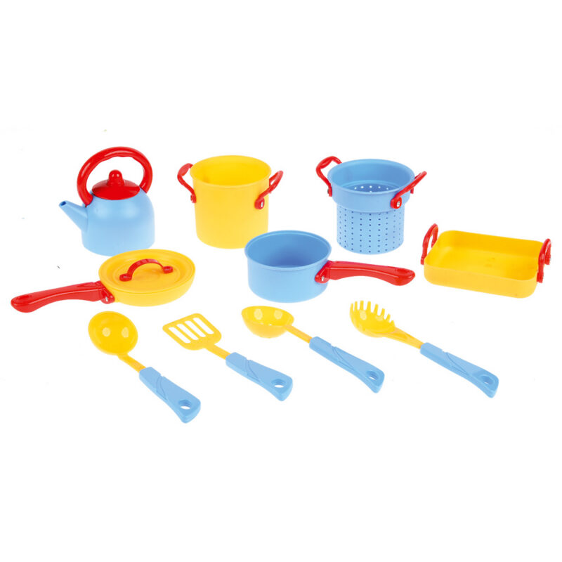 Suur värviliste köögitarvikute komplekt väikesele kokale. • 11 tarvikut • Mõõtmed 8 x 8 cm kuni 16 x 10 cm