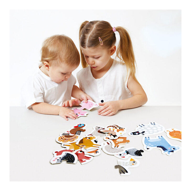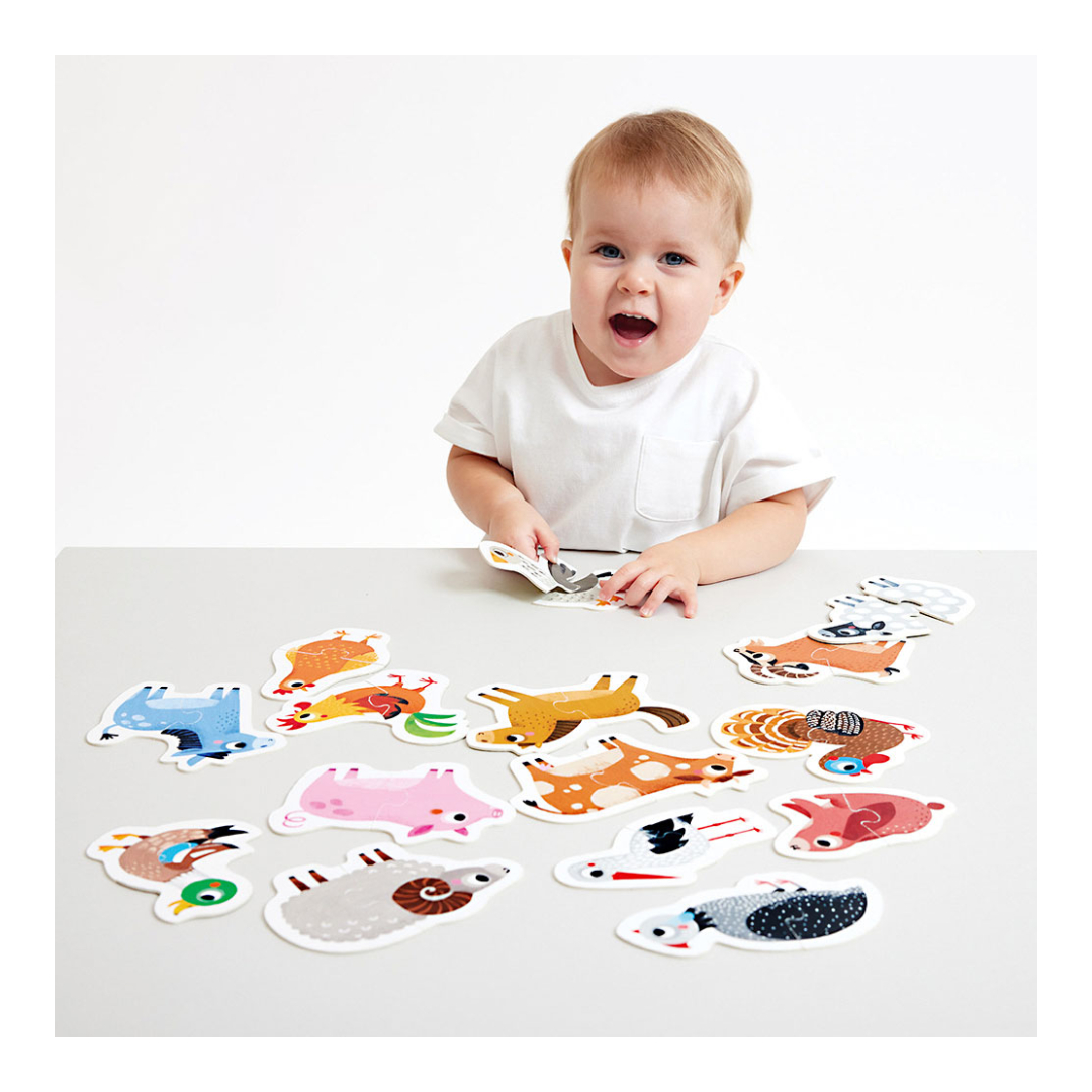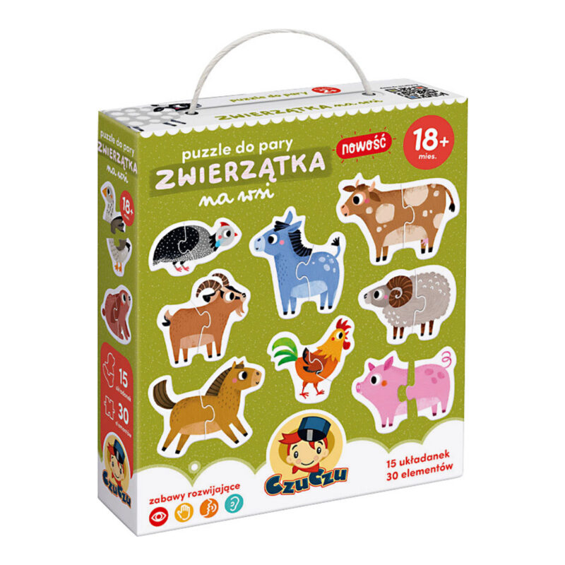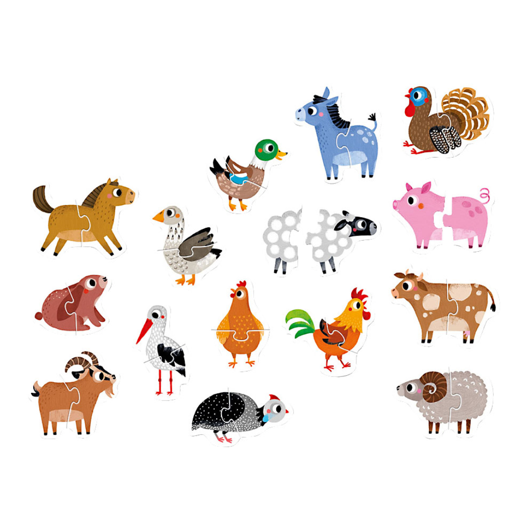 Kaheosalised pusled 15 erineva taluloomaga. Pusle kuju teeb sellest komplektist ideaalse esimese pusle väikelastele. Suured ja vastupidavad tükid on väikeste käte jaoks sobivad. • 15 puslet • 30 tükki, mõõtmetega 6,5 x 7,5 cm kuni 8,5 x 14 cm