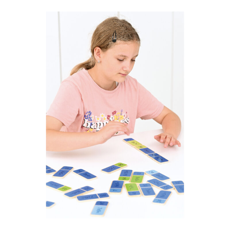 Matemaatika doomino on hariv mäng, mis annab põhiteadmised korrutamise ja jagamise kohta, hõlmates kogu korrutustabelit. Lisaks matemaatikaoskustele harjutavad lapsed värvide eristamist, suhtlemist ja koostööd ning peenmotoorikat.