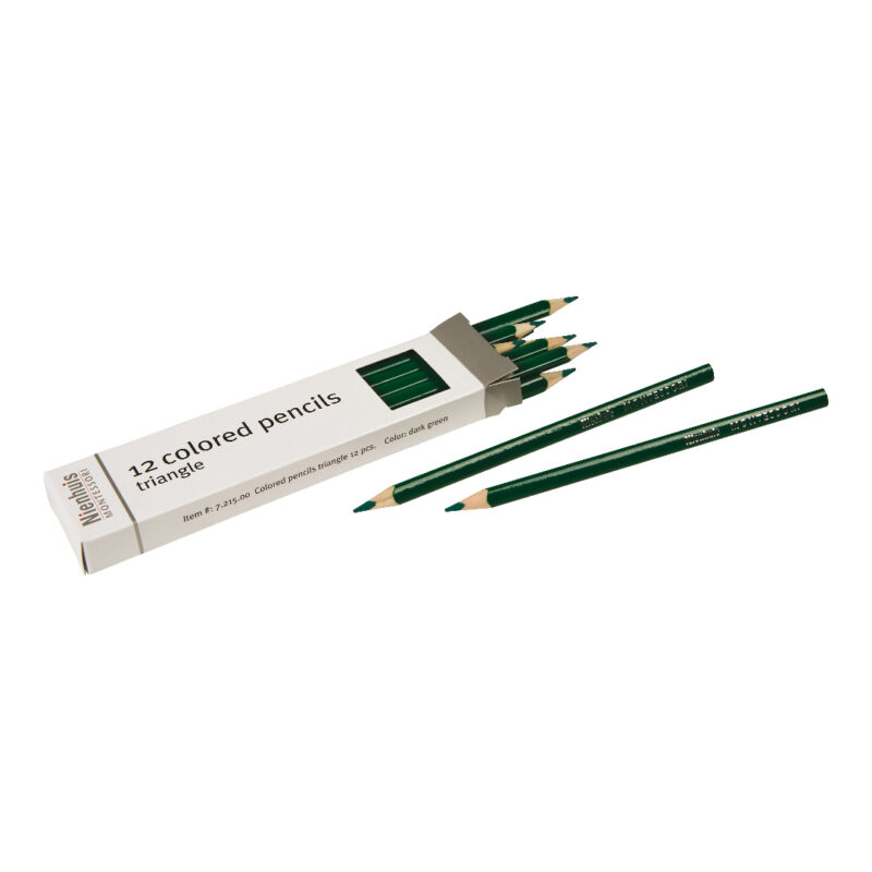 Ühevärviliste värvipliiatsite komplekt. Nende kolmnurkne kuju teeb värvipliiatsite ja -pliiatsite õige hoidmise õppimise lihtsaks. Värvipliiatseid saab kasutada koos teiste Montessori materjalidega. Ühes karbis on 12 värvipliiatsit. • Värvipliiatsi läbimõõt: 8 mm.