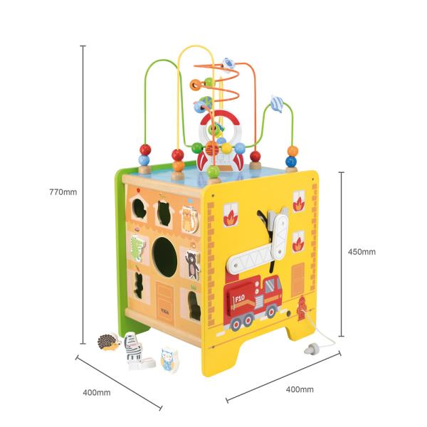 See hariv kuubik pakub 5 erinevat tegevust, mis arendavad käe-silma koordinatsiooni, loogilist mõtlemist, loovust ja kujutlusvõimet. See sisaldab pallirada, loomade sorteerijat, käike, tuletõrjeautot liigutatava redeli ja pikendatava tuletõrjehüdrandiga ning värvilist liugurit mustrikaartidega. Palliraja seina saab pahupidi pöörata.
