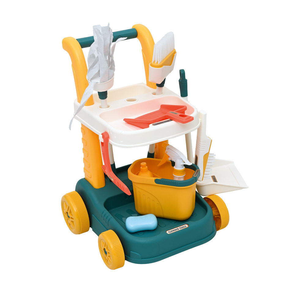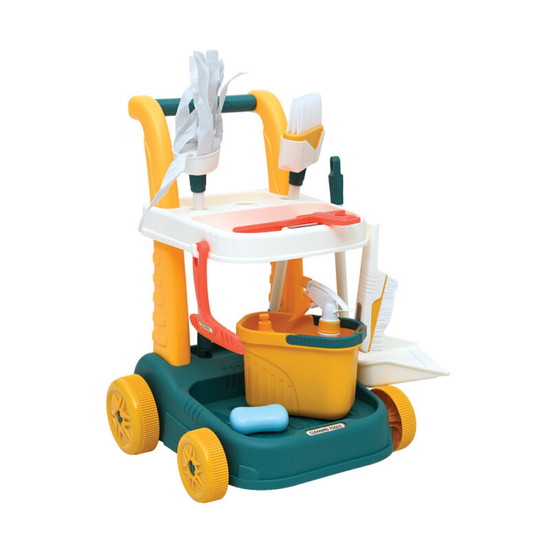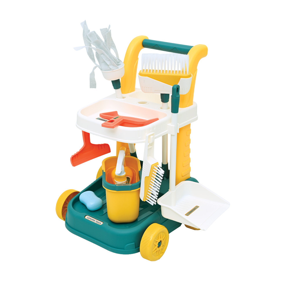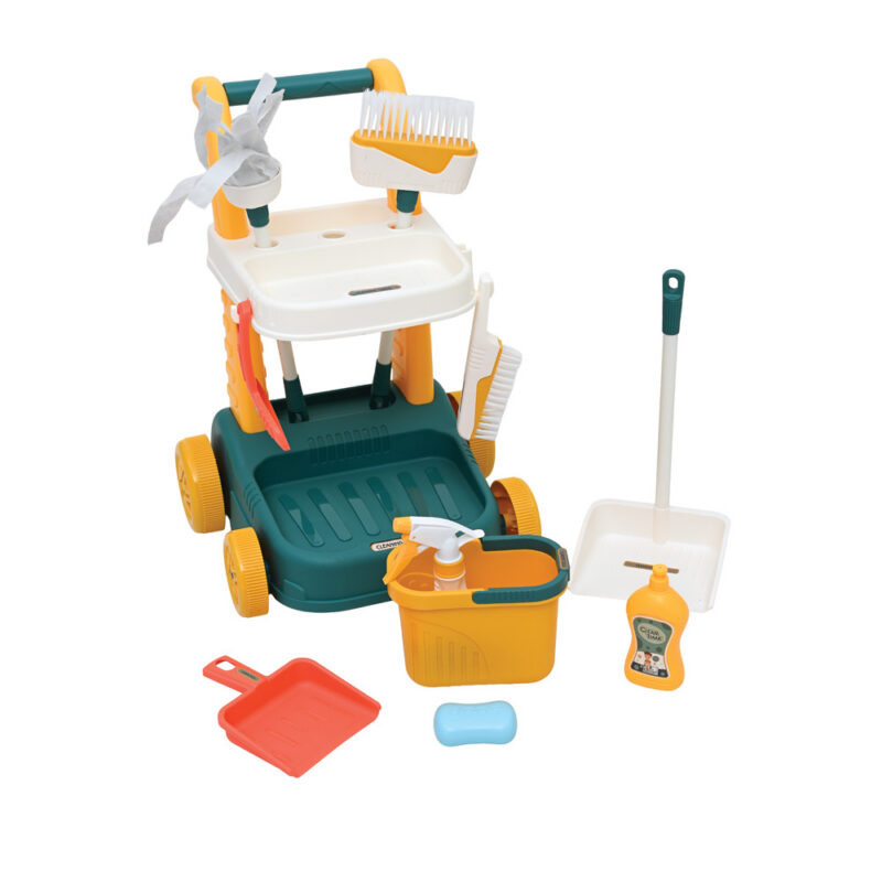 Funktsionaalne lastele mõeldud koristuskomplekt, mis võimaldab lastel mänguliselt õppida, arendades nende käelisi oskusi ja vastutustunnet. Komplekt sisaldab päris koristusvahendite miniatuurseid versioone, mida kõiki saab mugavalt kärus transportida ja hoiustada. Komplekt sisaldab: