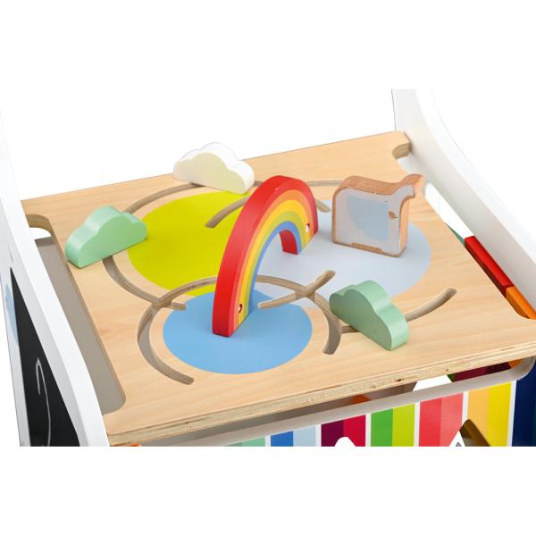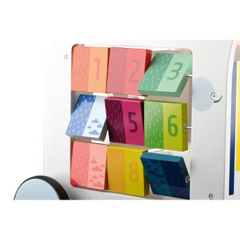 See multifunktsionaalne stabiilse puitkonstruktsiooniga käimisraam on varustatud arvukate hariduslike elementidega. Avataval kaanel on sõrmekaitse ja puidust liugurid. Käimisraami esiosa on kuuest osast koosnev sorteerimisvahend, paremal küljel on värviline arvelaud, mille plaatide tagaküljel on numbritele vastavad pilved. Vasakul küljel on kriiditahvlid ja tagaküljel on kolm kokkupandavat kolmnurka värvide õppimiseks. Käimisraami sisemust kasutatakse mänguasjade hoidmiseks ja transportimiseks. Ratastel on kummikate. Käimisraam toetab kõndimise õppimist, arendab motoorseid oskusi ja aitab teie lapsel õppida kujundeid, värve ja numbreid. • Sorteerimiselemendi mõõtmed: 5–6,5 cm • Käepideme kõrgus: 41,5 cm • Mõõtmed: 42 x 39 x 42 cm