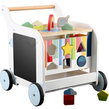 See multifunktsionaalne stabiilse puitkonstruktsiooniga käimisraam on varustatud arvukate hariduslike elementidega. Avataval kaanel on sõrmekaitse ja puidust liugurid. Käimisraami esiosa on kuuest osast koosnev sorteerimisvahend, paremal küljel on värviline arvelaud, mille plaatide tagaküljel on numbritele vastavad pilved. Vasakul küljel on kriiditahvlid ja tagaküljel on kolm kokkupandavat kolmnurka värvide õppimiseks. Käimisraami sisemust kasutatakse mänguasjade hoidmiseks ja transportimiseks. Ratastel on kummikate. Käimisraam toetab kõndimise õppimist, arendab motoorseid oskusi ja aitab teie lapsel õppida kujundeid, värve ja numbreid. • Sorteerimiselemendi mõõtmed: 5–6,5 cm • Käepideme kõrgus: 41,5 cm • Mõõtmed: 42 x 39 x 42 cm