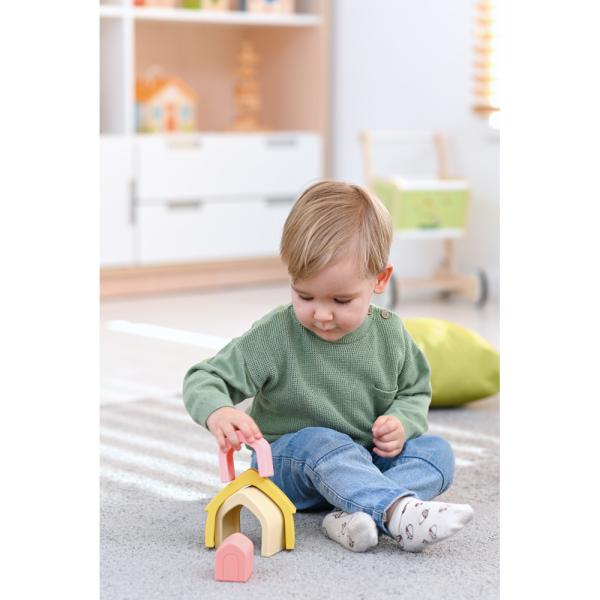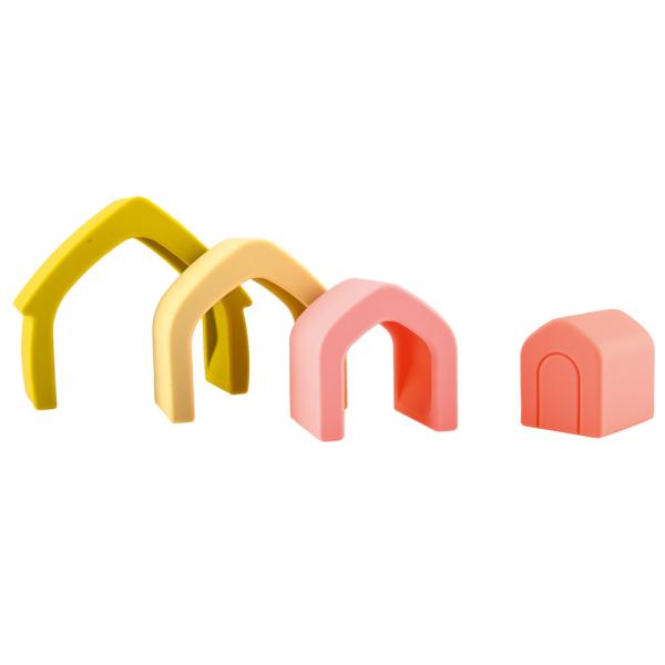 See majakujuline silikoonist virnastaja on hariv mängukomplekt kõige pisematele. See koosneb neljast klotsist, millest igaüks moodustab väikese maja katuse ja seinad. See mänguasi toetab laste loovust, probleemide lahendamise oskusi ning motoorset ja kognitiivset arengut.