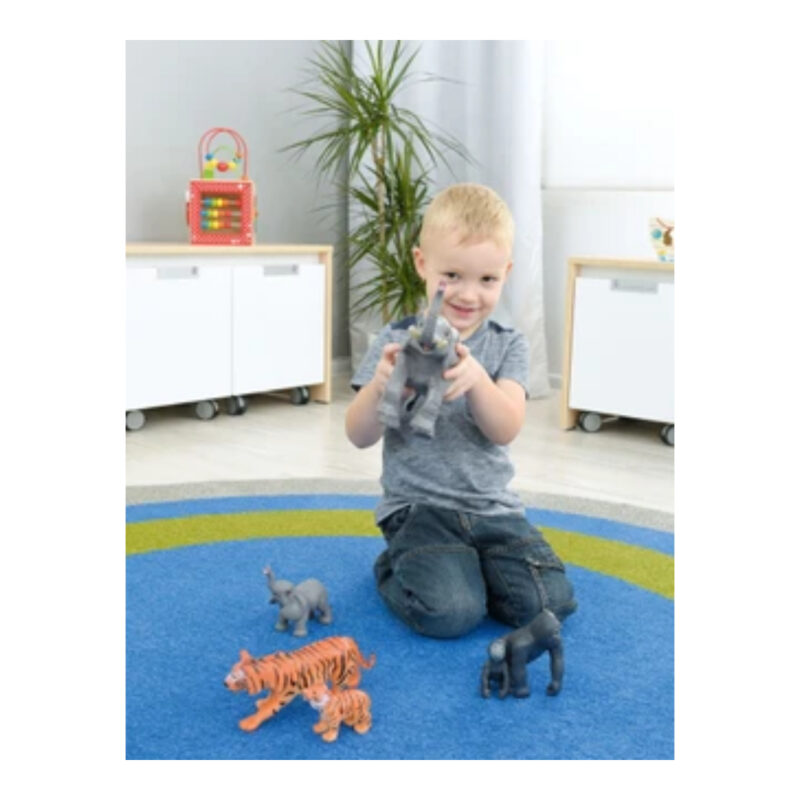 Džungliloomad – ema ja järglane – 6 plastmassist loomamudelit (isane elevant ja beebielevant, emane gorilla ja beebigorilla, emane tiiger ja beebitiiger) on väikeste laste käte jaoks ideaalse suurusega. Mänguasjad arendavad väikelaste kujutlusvõimet, maailmavaadet ja sõnavara. • Loomade mõõtmed jäävad vahemikku 4 x 4 x 7 cm kuni 26,5 x 8,5 x 15,5 cm. • Komplekt on pakendatud mugavasse pappkarpi • Hariv juhend